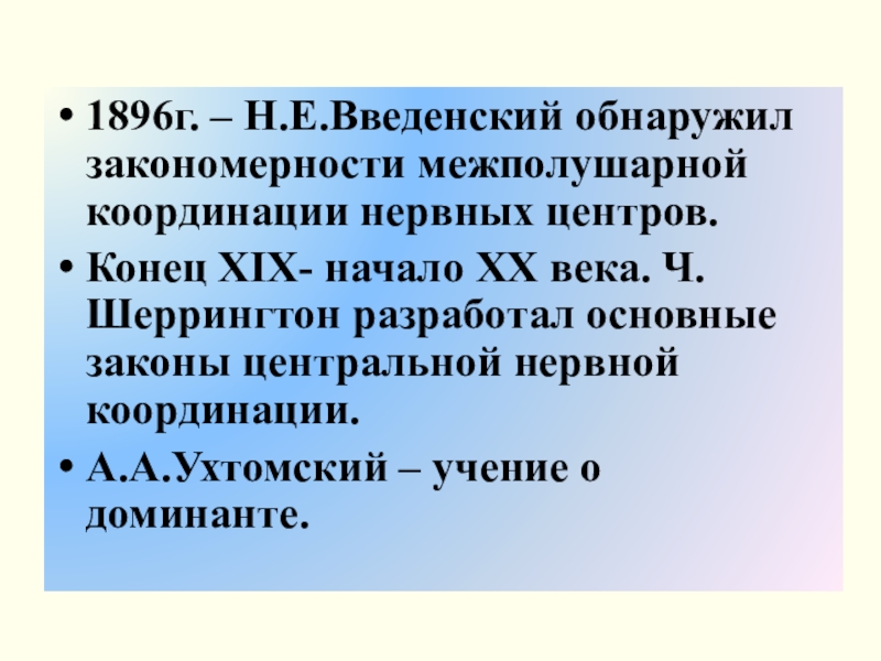 1896г. – Н.Е.Введенский обнаружил закономерности межполушарной координации нервных центров. Конец XIX- начало XX века. Ч.Шеррингтон разработал основные законы центральной нервной координации.А.А.Ухтомский – учение о доминанте.