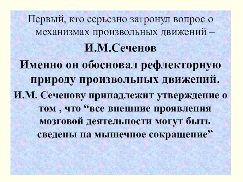 Первый, кто серьезно затронул вопрос о механизмах произвольных движений – И.М.СеченовИменно он обосновал рефлекторную природу произвольных движений.