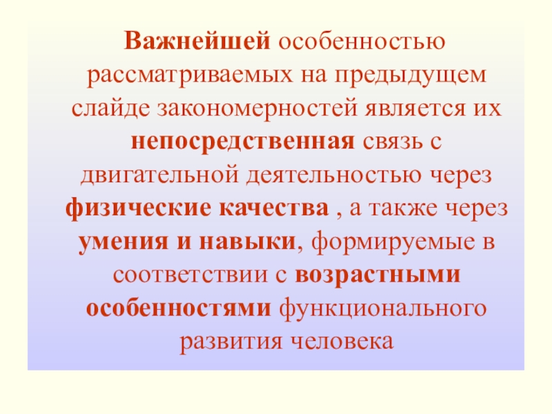 Важнейшей особенностью рассматриваемых на предыдущем слайде закономерностей является их непосредственная связь с двигательной деятельностью через