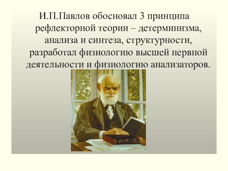 И.П.Павлов обосновал 3 принципа рефлекторной теории – детерминизма, анализа и синтеза, структурности, разработал физиологию высшей нервной деятельности
