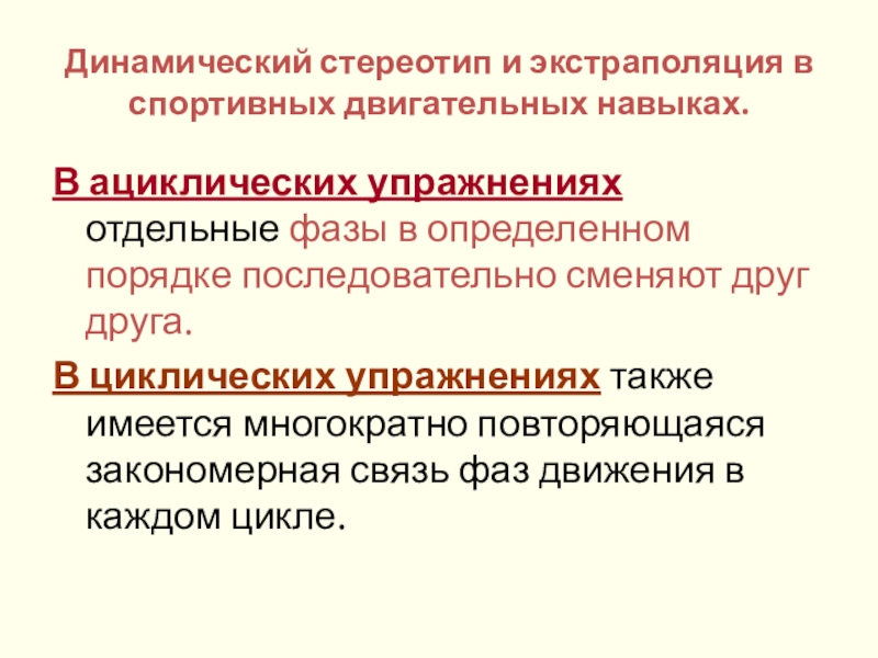 Динамический стереотип и экстраполяция в спортивных двигательных навыках.В ациклических упражнениях отдельные фазы в определенном порядке последовательно сменяют
