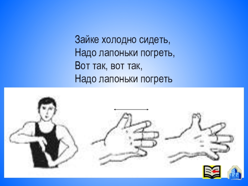 Слайд 3Зайке холодно сидеть, Надо лапоньки погреть, Вот так, вот так,