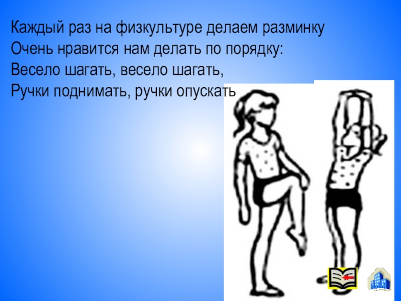 Каждый раз на физкультуре делаем разминку  Очень нравится нам делать по порядку:  Весело шагать, весело