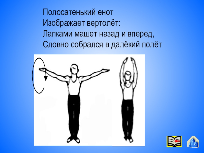 Слайд 6Полосатенький енот Изображает вертолёт: Лапками машет назад и вперед, Словно собрался