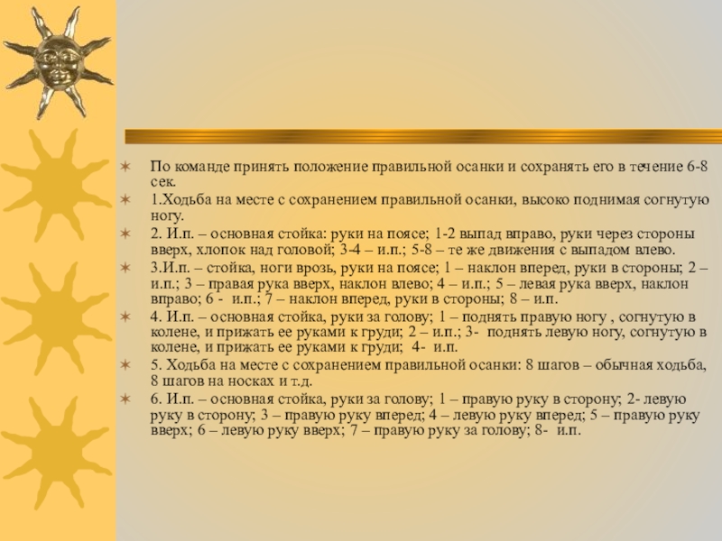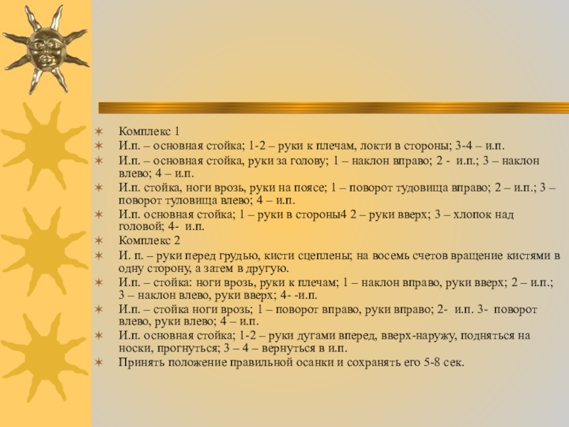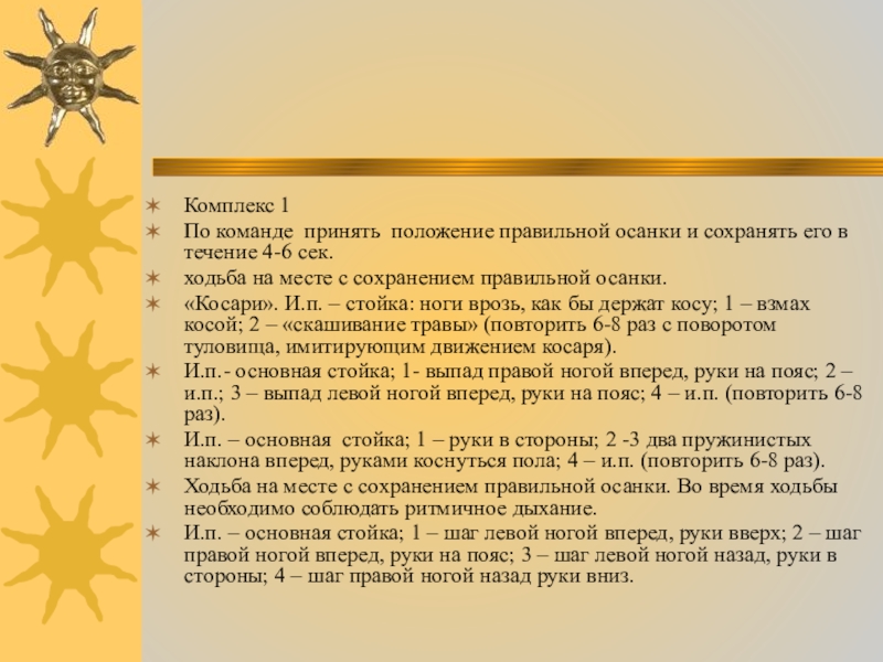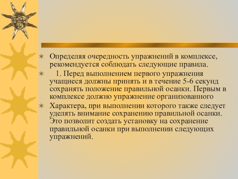 Перед выполнением первого упражнения учащиеся должны принять и в течение 5-6 секунд сохранять положение правильной осанки. Первым в комплексе должно упражнение организованного