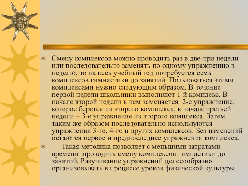 Такая методика позволяет с меньшими затратами времени проводить смену комплексов гимнастики до занятий. Разучивание упражнений целесообразно организовывать в процессе уроков физической культуры.