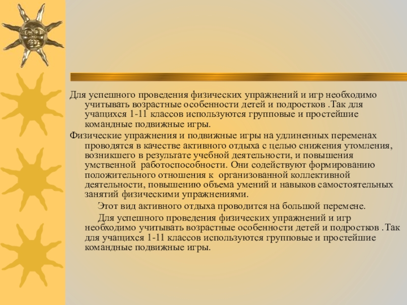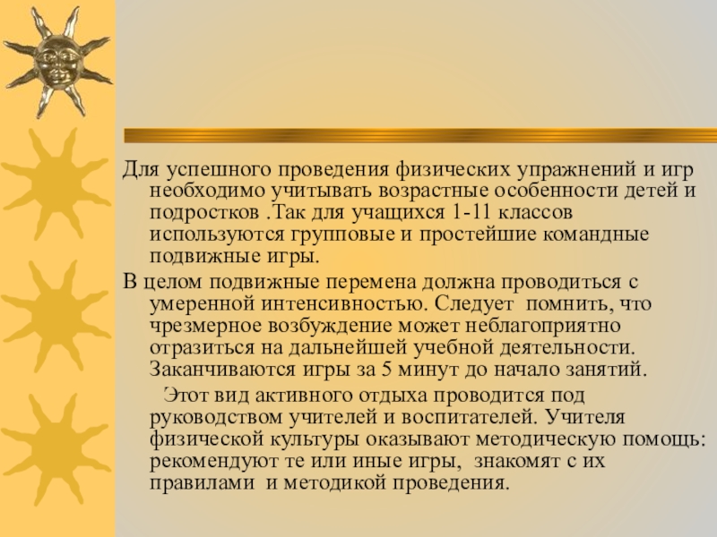 Для успешного проведения физических упражнений и игр необходимо учитывать возрастные особенности детей и подростков .Так для учащихся 1-11 классов используются групповые и простейшие командные подвижные игры.