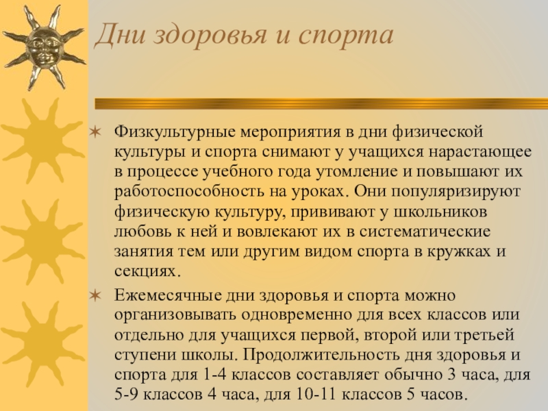 Ежемесячные дни здоровья и спорта можно организовывать одновременно для всех классов или отдельно для учащихся первой, второй или третьей ступени школы. Продолжительность дня здоровья и спорта для 1-4 классов составляет обычно 3 часа, для 5-9 классов 4 часа, для 10-11 классов 5 часов.