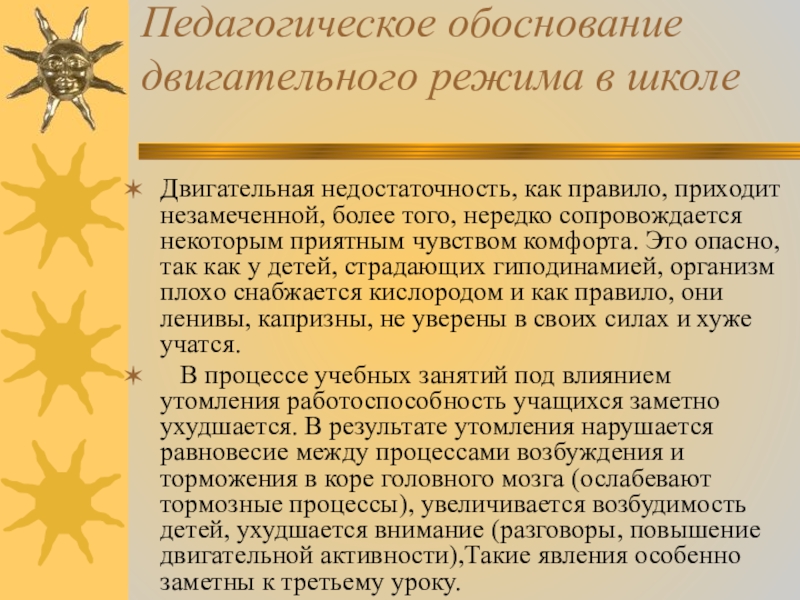 Слайд 3Педагогическое обоснование двигательного режима в школе