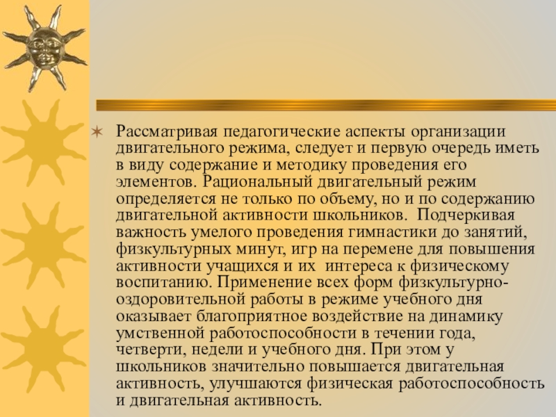 Рассматривая педагогические аспекты организации двигательного режима, следует и первую очередь иметь