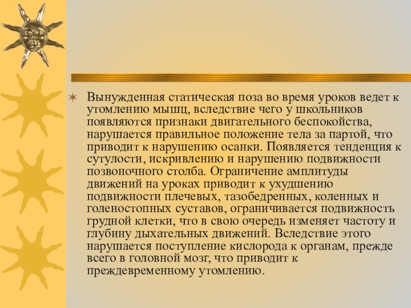 чего у школьников появляются признаки двигательного беспокойства, нарушается правильное положение тела за партой, что приводит к нарушению осанки. Появляется тенденция к сутулости, искривлению и нарушению подвижности позвоночного столба. Ограничение амплитуды движений на уроках приводит к ухудшению подвижности плечевых, тазобедренных, коленных и голеностопных суставов, ограничивается подвижность грудной клетки, что в свою очередь изменяет частоту и глубину дыхательных движений. Вследствие этого нарушается поступление кислорода к органам, прежде всего в головной мозг, что приводит к преждевременному утомлению.
