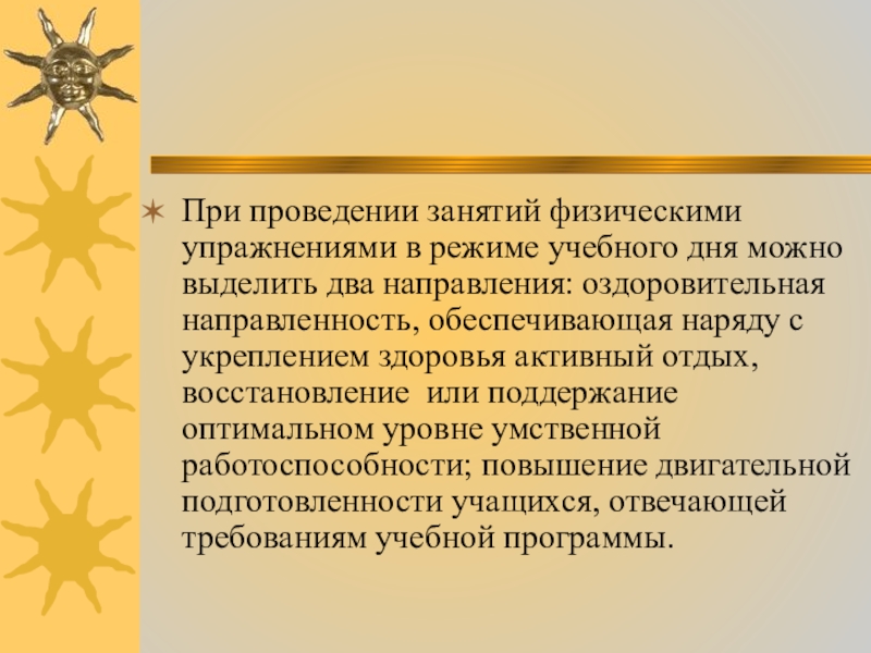 При проведении занятий физическими упражнениями в режиме учебного дня можно выделить