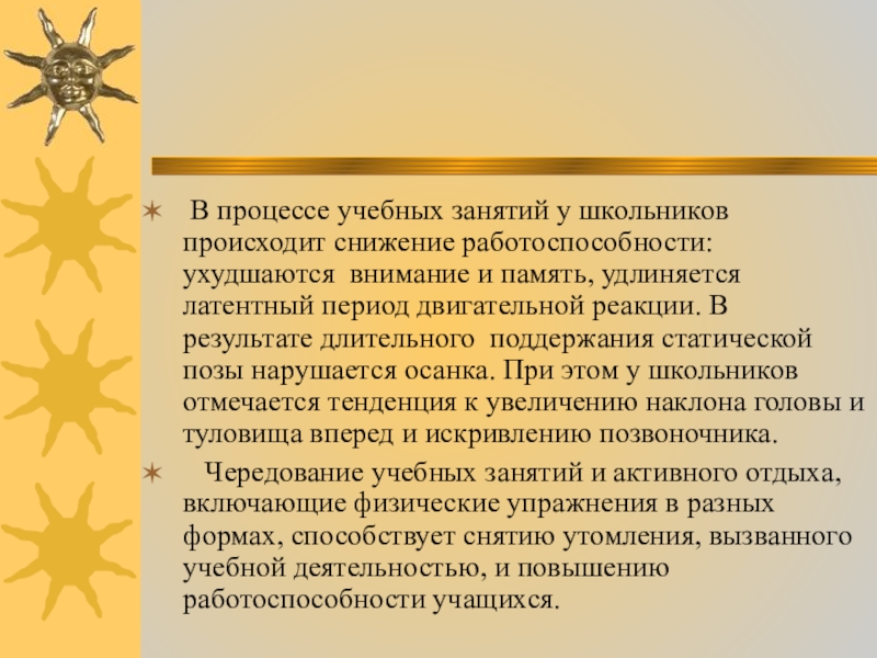 В процессе учебных занятий у школьников происходит снижение работоспособности: ухудшаются