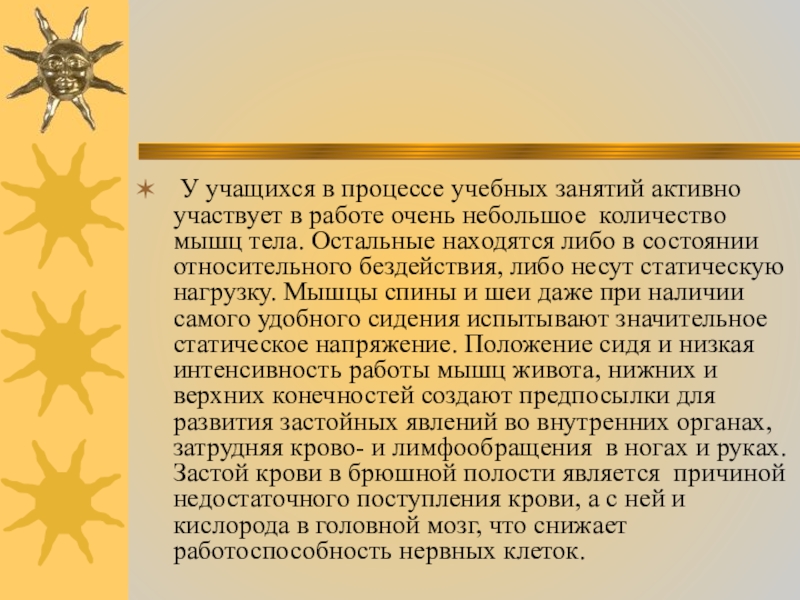 очень небольшое количество мышц тела. Остальные находятся либо в состоянии относительного бездействия, либо несут статическую нагрузку. Мышцы спины и шеи даже при наличии самого удобного сидения испытывают значительное статическое напряжение. Положение сидя и низкая интенсивность работы мышц живота, нижних и верхних конечностей создают предпосылки для развития застойных явлений во внутренних органах, затрудняя крово- и лимфообращения в ногах и руках. Застой крови в брюшной полости является причиной недостаточного поступления крови, а с ней и кислорода в головной мозг, что снижает работоспособность нервных клеток.