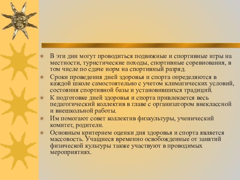 К подготовке дней здоровья и спорта привлекается весь педагогический коллектив в главе с организатором внеклассной и внешкольной работы.