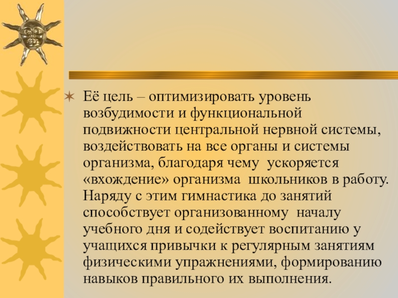 системы, воздействовать на все органы и системы организма, благодаря чему ускоряется «вхождение» организма школьников в работу. Наряду с этим гимнастика до занятий способствует организованному началу учебного дня и содействует воспитанию у учащихся привычки к регулярным занятиям физическими упражнениями, формированию навыков правильного их выполнения.