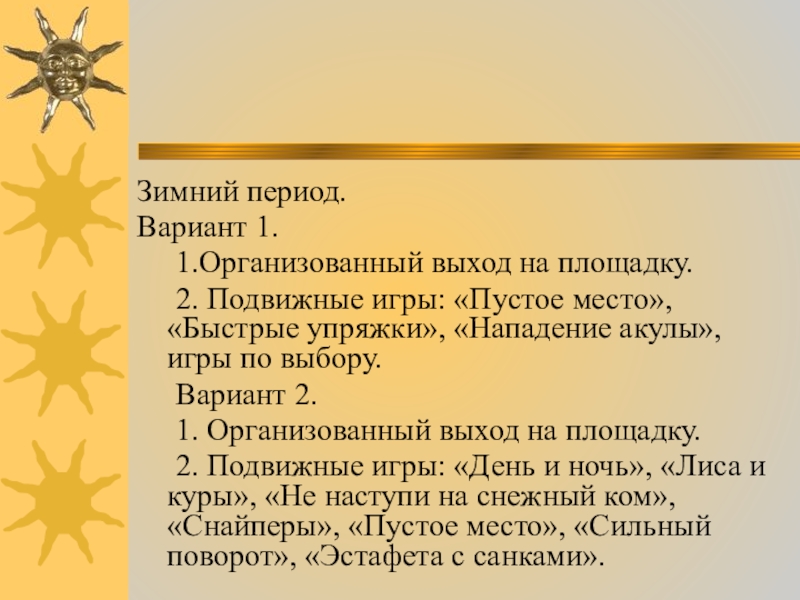 2. Подвижные игры: «День и ночь», «Лиса и куры», «Не наступи на снежный ком», «Снайперы», «Пустое место», «Сильный поворот», «Эстафета с санками».