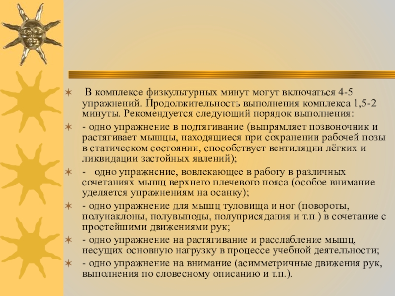 В комплексе физкультурных минут могут включаться 4-5 упражнений. Продолжительность выполнения