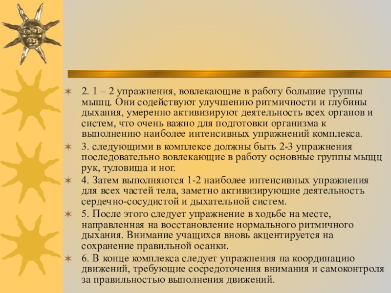 Они содействуют улучшению ритмичности и глубины дыхания, умеренно активизируют деятельность всех органов и систем, что очень важно для подготовки организма к выполнению наиболее интенсивных упражнений комплекса.
