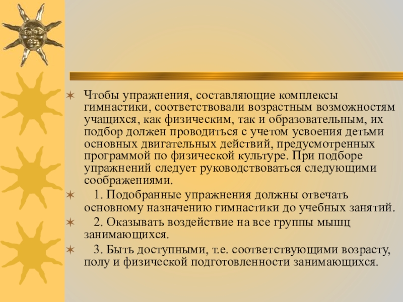 Чтобы упражнения, составляющие комплексы гимнастики, соответствовали возрастным возможностям учащихся, как физическим,