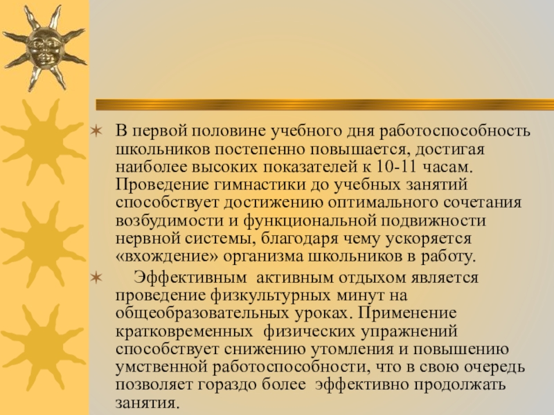высоких показателей к 10-11 часам. Проведение гимнастики до учебных занятий способствует достижению оптимального сочетания возбудимости и функциональной подвижности нервной системы, благодаря чему ускоряется «вхождение» организма школьников в работу.