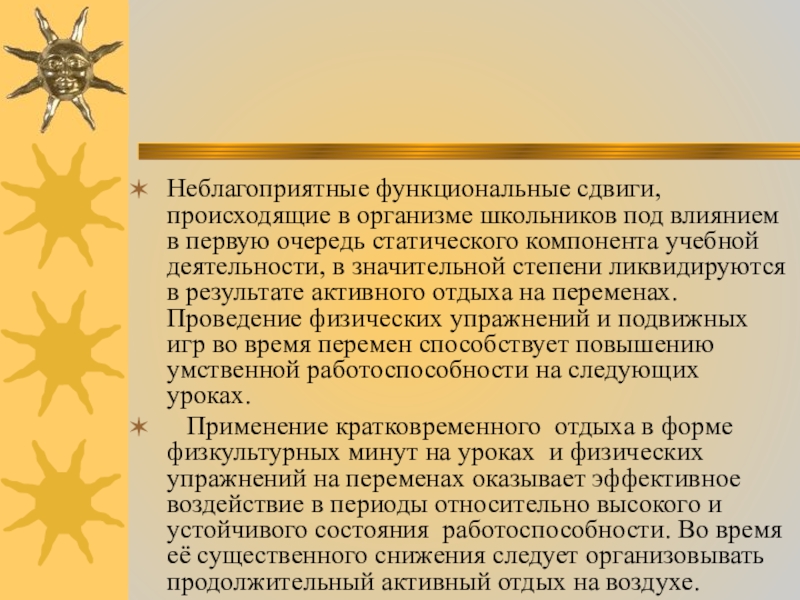 Применение кратковременного отдыха в форме физкультурных минут на уроках и физических упражнений на переменах оказывает эффективное воздействие в периоды относительно высокого и устойчивого состояния работоспособности. Во время её существенного снижения следует организовывать продолжительный активный отдых на воздухе.