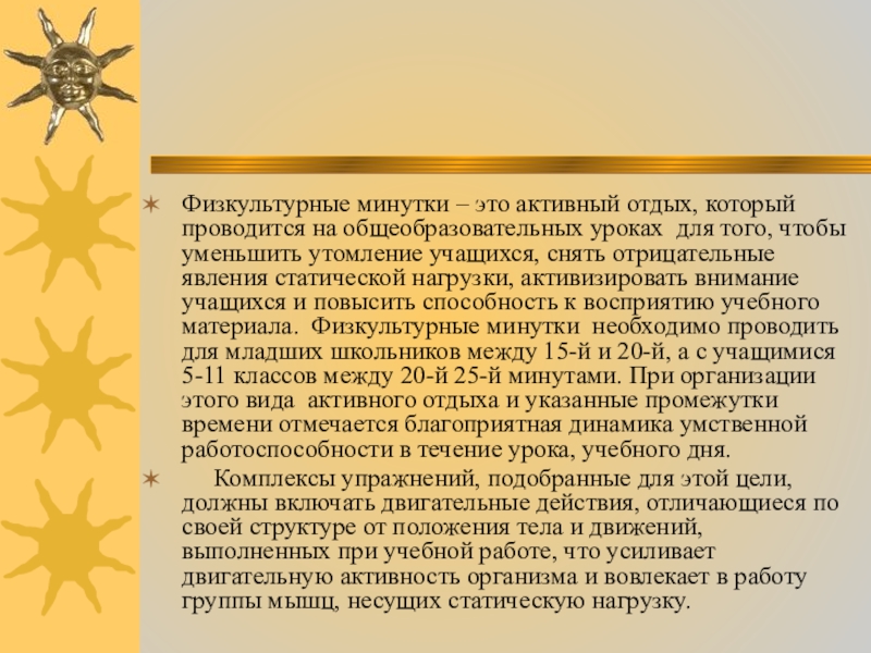 Физкультурные минутки – это активный отдых, который проводится на общеобразовательных уроках