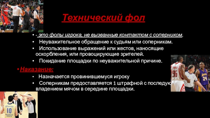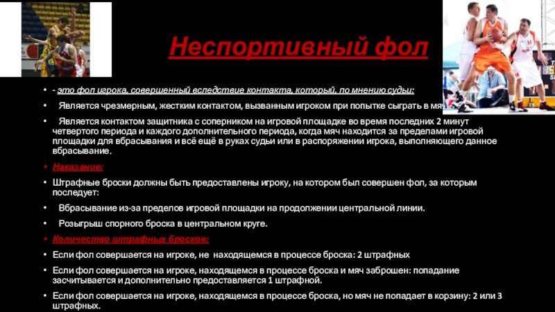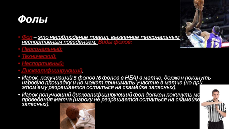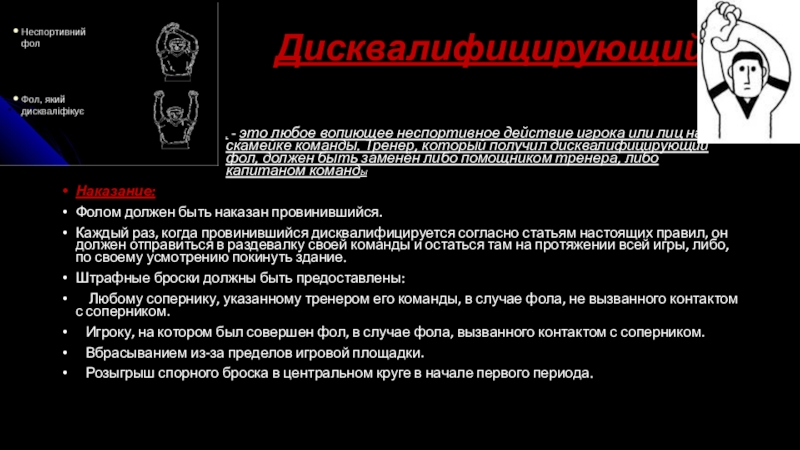 . - это любое вопиющее неспортивное действие игрока или лиц на скамейке команды. Тренер, который получил дисквалифицирующий фол, должен быть заменён либо помощником тренера, либо капитаном команды