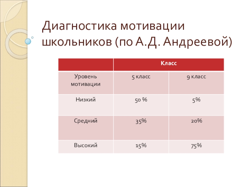 Слайд 9Диагностика мотивации школьников (по А.Д. Андреевой)