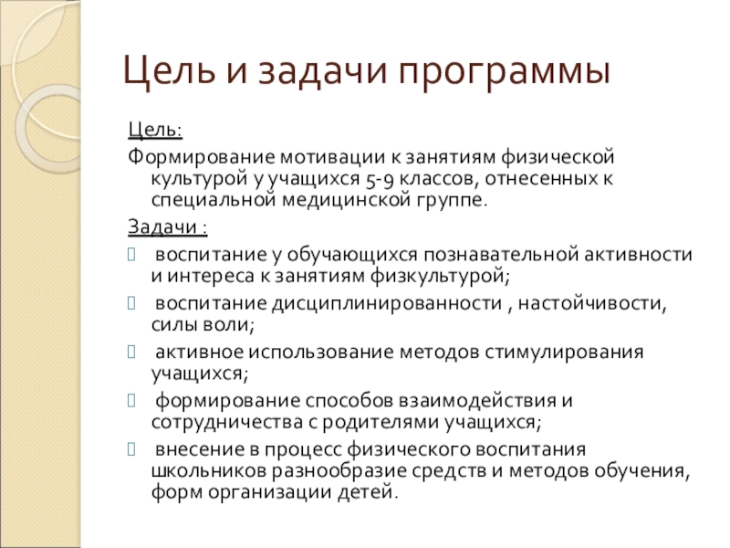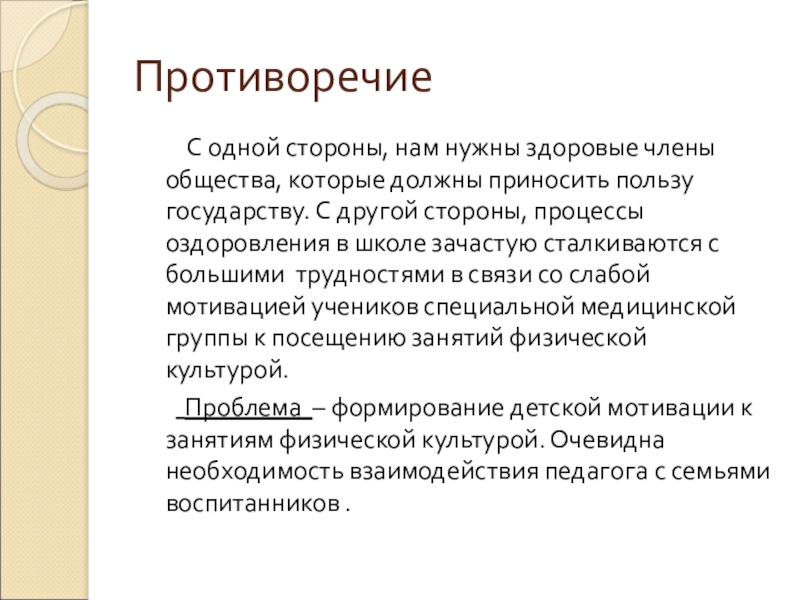 члены общества, которые должны приносить пользу государству. С другой стороны, процессы оздоровления в школе зачастую сталкиваются с большими трудностями в связи со слабой мотивацией учеников специальной медицинской группы к посещению занятий физической культурой.