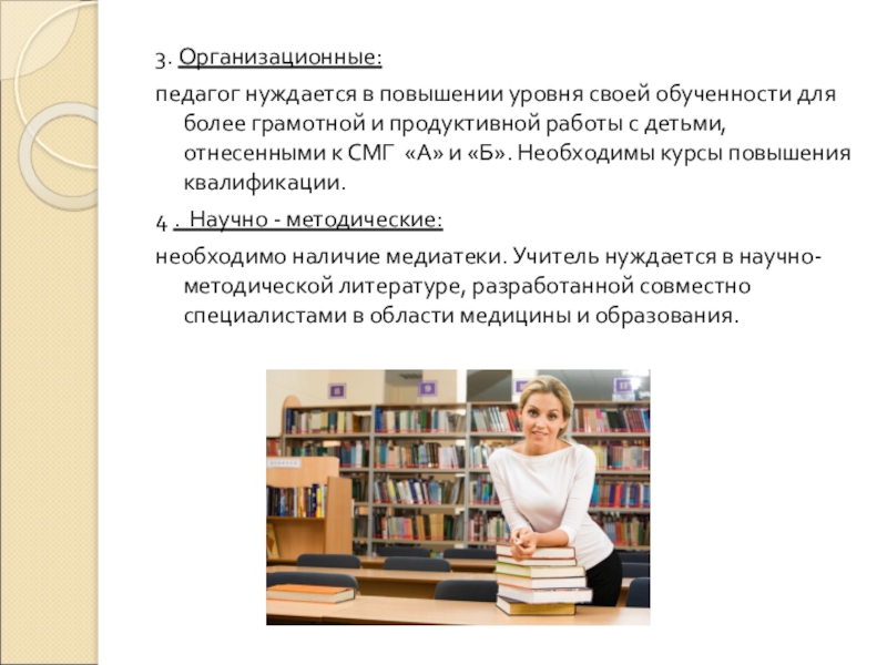 необходимо наличие медиатеки. Учитель нуждается в научно-методической литературе, разработанной совместно специалистами в области медицины и образования.