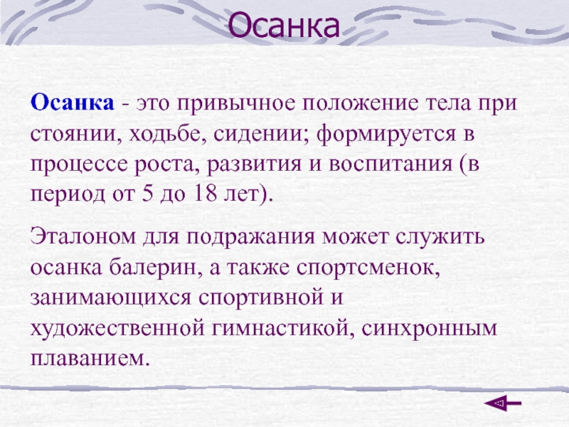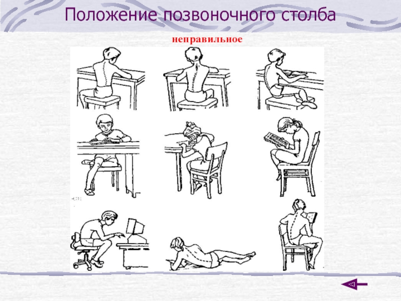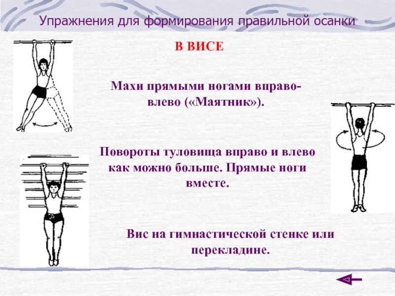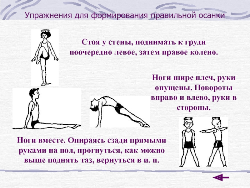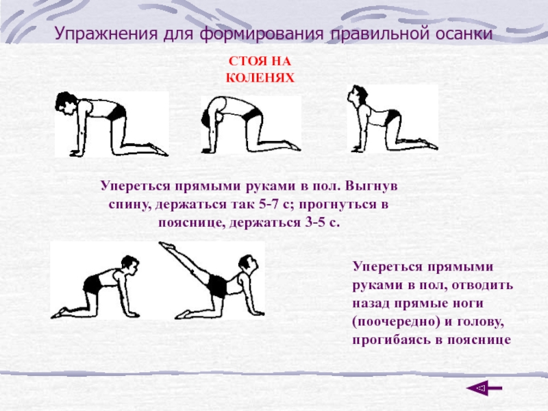 Упереться прямыми руками в пол, отводить назад прямые ноги (поочередно) и голову, прогибаясь в пояснице