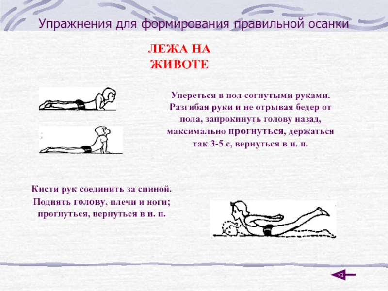 Кисти рук соединить за спиной. Поднять голову, плечи и ноги; прогнуться, вернуться в и. п.