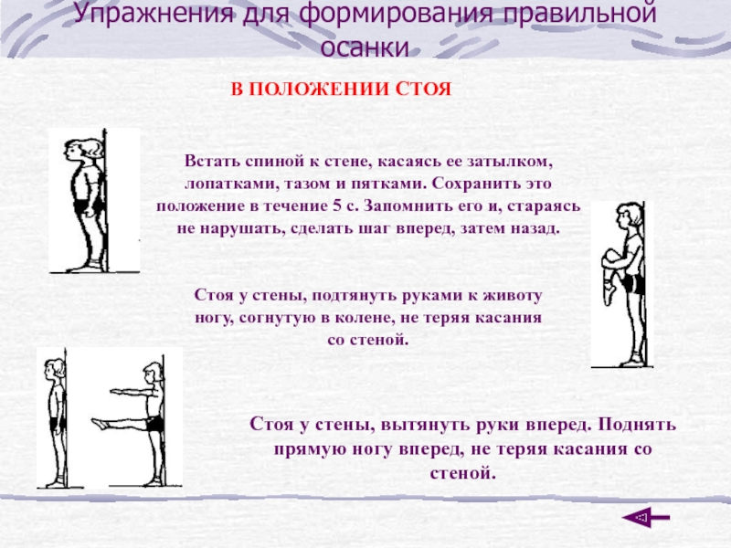 Стоя у стены, вытянуть руки вперед. Поднять прямую ногу вперед, не теряя касания со стеной.