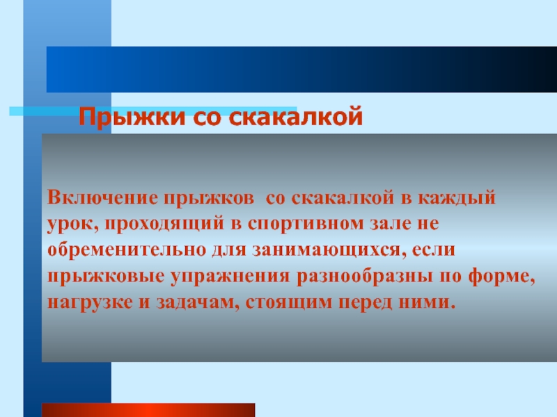 Слайд 21Включение прыжков со скакалкой в каждый урок, проходящий в спортивном зале