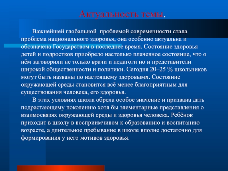 актуальна и обозначена Государством в последнее время. Состояние здоровья детей и подростков приобрело настолько плачевное состояние, что о нём заговорили не только врачи и педагоги но и представители широкой общественности и политики. Сегодня 20–25 % школьников могут быть названы по настоящему здоровыми. Состояние окружающей среды становится всё менее благоприятным для существования человека, его здоровья.