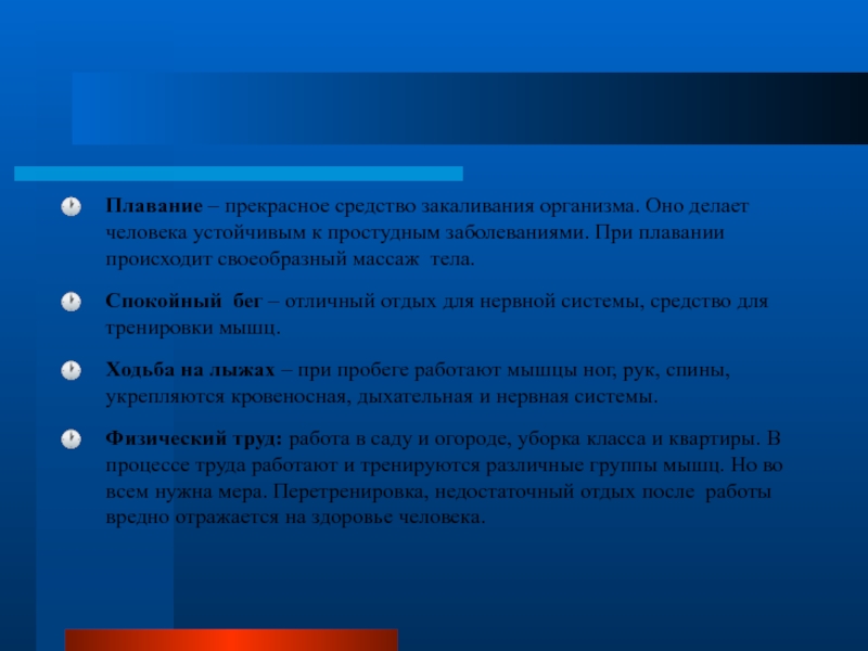 Физический труд: работа в саду и огороде, уборка класса и квартиры. В процессе труда работают и тренируются различные группы мышц. Но во всем нужна мера. Перетренировка, недостаточный отдых после работы вредно отражается на здоровье человека.