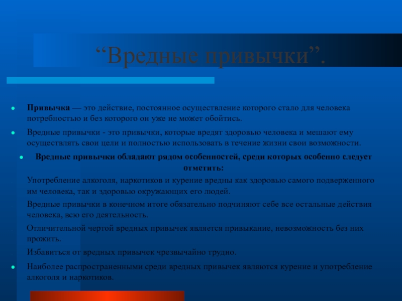 Вредные привычки - это привычки, которые вредят здоровью человека и мешают ему осуществлять свои цели и полностью использовать в течение жизни свои возможности.