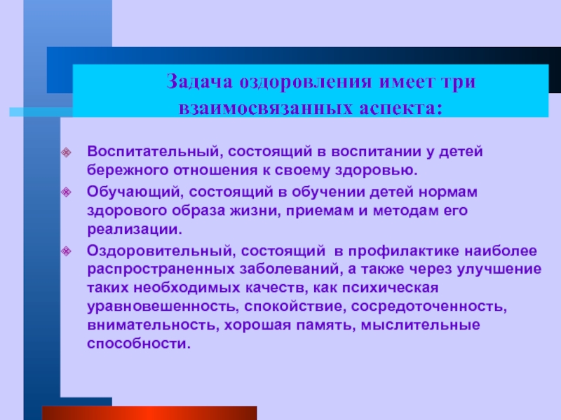 Слайд 5 Задача оздоровления имеет три взаимосвязанных аспекта: