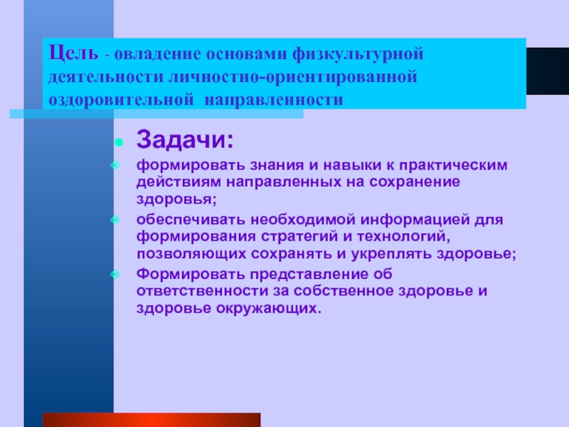 Слайд 4Цель - овладение основами физкультурной деятельности личностно-ориентированной оздоровительной направленности