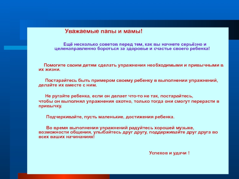 Постарайтесь быть примером своему ребенку в выполнении упражнений, делайте их вместе с ним.