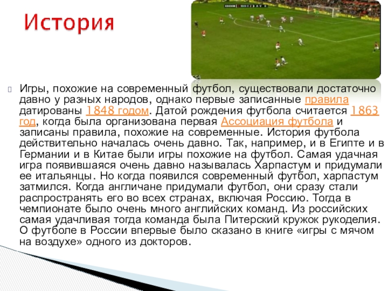 однако первые записанные правила датированы 1848 годом. Датой рождения футбола считается 1863 год, когда была организована первая Ассоциация футбола и записаны правила, похожие на современные. История футбола действительно началась очень давно. Так, например, и в Египте и в Германии и в Китае были игры похожие на футбол. Самая удачная игра появившаяся очень давно называлась Харпастум и придумали ее итальянцы. Но когда появился современный футбол, харпастум затмился. Когда англичане придумали футбол, они сразу стали распространять его во всех странах, включая Россию. Тогда в чемпионате было очень много английских команд. Из российских самая удачливая тогда команда была Питерский кружок рукоделия. О футболе в России впервые было сказано в книге «игры с мячом на воздухе» одного из докторов.