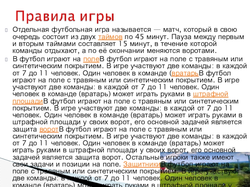 В футбол играют на полеВ футбол играют на поле с травяным или синтетическим покрытием. В игре участвуют две команды: в каждой от 7 до 11 человек. Один человек в команде (вратарьВ футбол играют на поле с травяным или синтетическим покрытием. В игре участвуют две команды: в каждой от 7 до 11 человек. Один человек в команде (вратарь) может играть руками в штрафной площадиВ футбол играют на поле с травяным или синтетическим покрытием. В игре участвуют две команды: в каждой от 7 до 11 человек. Один человек в команде (вратарь) может играть руками в штрафной площади у своих ворот, его основной задачей является защита воротВ футбол играют на поле с травяным или синтетическим покрытием. В игре участвуют две команды: в каждой от 7 до 11 человек. Один человек в команде (вратарь) может играть руками в штрафной площади у своих ворот, его основной задачей является защита ворот. Остальные игроки также имеют свои задачи и позиции на поле. ЗащитникиВ футбол играют на поле с травяным или синтетическим покрытием. В игре участвуют две команды: в каждой от 7 до 11 человек. Один человек в команде (вратарь) может играть руками в штрафной площади у своих ворот, его основной задачей является защита ворот. Остальные игроки также имеют свои задачи и позиции на поле. Защитники располагаются в основном на своей половине поля, их задача — противодействовать нападающим игрокам противоположной команды. ПолузащитникиВ футбол играют на поле с травяным или синтетическим покрытием. В игре участвуют две команды: в каждой от 7 до 11 человек. Один человек в команде (вратарь) может играть руками в штрафной площади у своих ворот, его основной задачей является защита ворот. Остальные игроки также имеют свои задачи и позиции на поле. Защитники располагаются в основном на своей половине поля, их задача — противодействовать нападающим игрокам противоположной команды. Полузащитники действуют в середине поля, их роль — помогать защитникам или нападающим в зависимости от игровой ситуации. НападающиеВ футбол играют на поле с травяным или синтетическим покрытием. В игре участвуют две команды: в каждой от 7 до 11 человек. Один человек в команде (вратарь) может играть руками в штрафной площади у своих ворот, его основной задачей является защита ворот. Остальные игроки также имеют свои задачи и позиции на поле. Защитники располагаются в основном на своей половине поля, их задача — противодействовать нападающим игрокам противоположной команды. Полузащитники действуют в середине поля, их роль — помогать защитникам или нападающим в зависимости от игровой ситуации. Нападающие располагаются, преимущественно на половине поля соперника, основная задача — забивать голы.