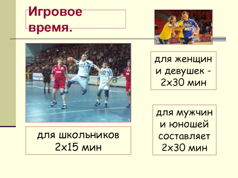 время мужские и женские команды играют почти исключительно в малый гандбол (зальный гандбол). До середины 60-х гг. в международной практике была распространена прежняя форма гандбола - большой гандбол или гандбол на больших полях.
