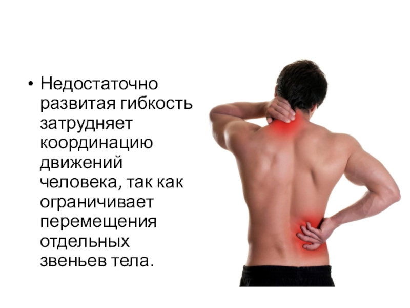 Слайд 3Недостаточно развитая гибкость затрудняет координацию движений человека, так как ограничивает перемещения