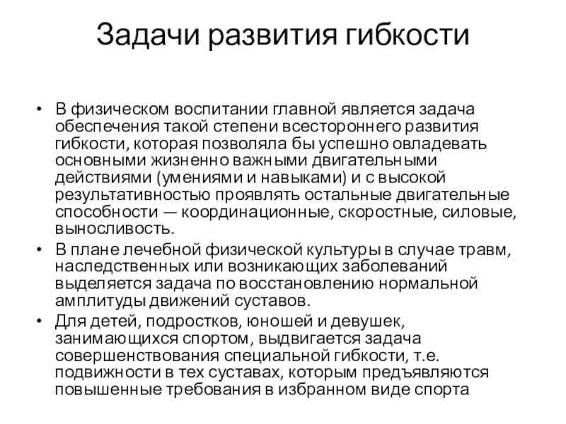 всестороннего развития гибкости, которая позволяла бы успешно овладевать основными жизненно важными двигательными действиями (умениями и навыками) и с высокой результативностью проявлять остальные двигательные способности — координационные, скоростные, силовые, выносливость.