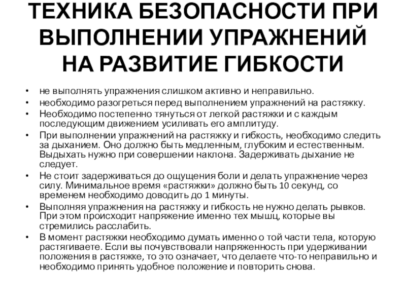 Слайд 20ТЕХНИКА БЕЗОПАСНОСТИ ПРИ ВЫПОЛНЕНИИ УПРАЖНЕНИЙ НА РАЗВИТИЕ ГИБКОСТИ