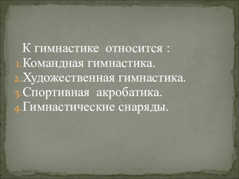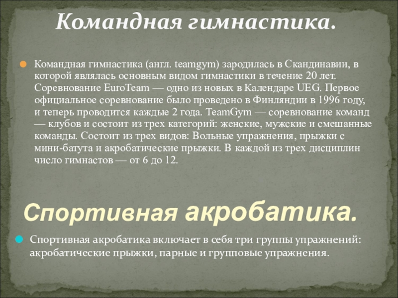 Спортивная акробатика включает в себя три группы упражнений: акробатические прыжки, парные и групповые упражнения.