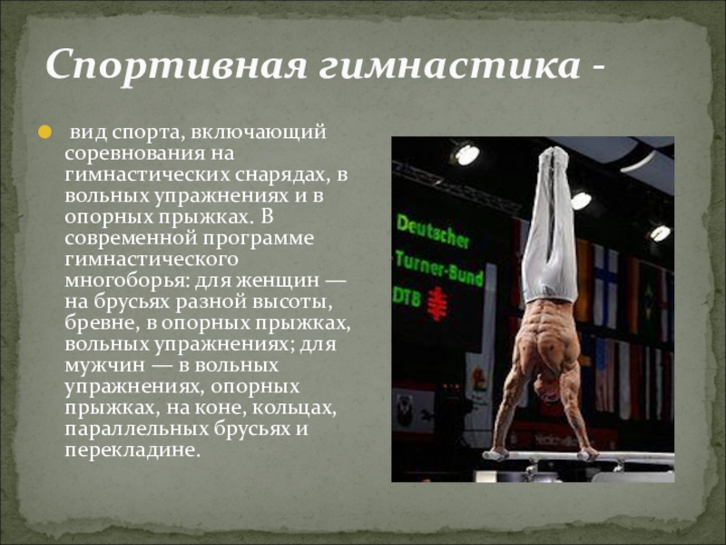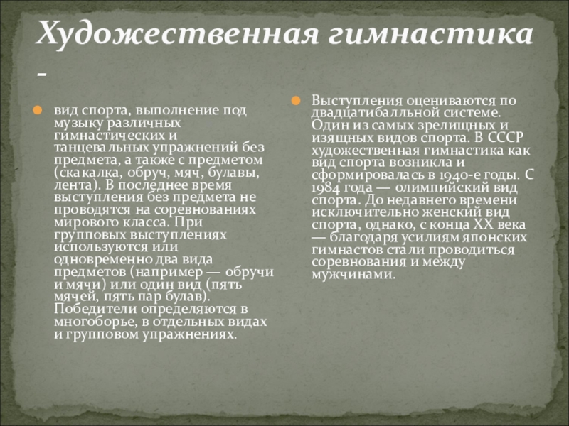 Выступления оцениваются по двадцатибалльной системе. Один из самых зрелищных и изящных видов спорта. В СССР художественная гимнастика как вид спорта возникла и сформировалась в 1940-е годы. С 1984 года — олимпийский вид спорта. До недавнего времени исключительно женский вид спорта, однако, с конца XX века — благодаря усилиям японских гимнастов стали проводиться соревнования и между мужчинами.