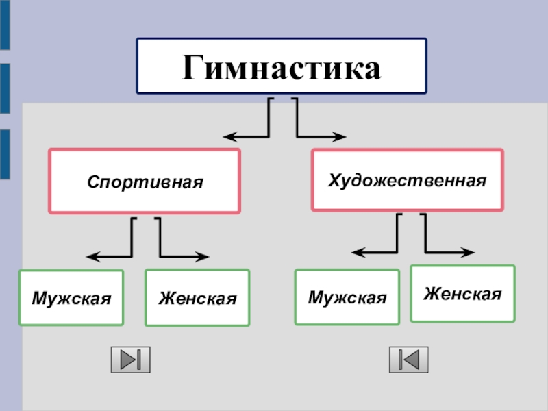 В современной программе гимнастического многоборья: для женщин — на брусьях разной высоты, бревне, в опорных прыжках, вольных упражнениях; для мужчин — в вольных упражнениях, опорных прыжках, на коне, кольцах, параллельных брусьях и перекладине.